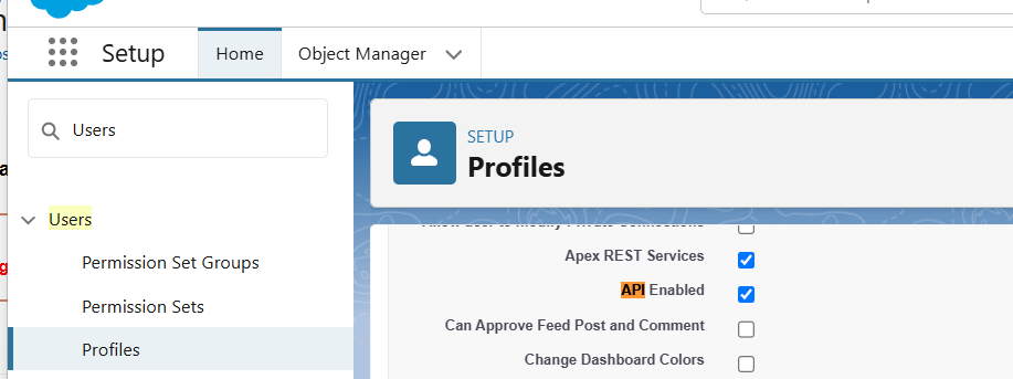 - Edit the profile of the user you’ll be authenticating with. (Your user may already be assigned a profile with all of these permissions enabled)