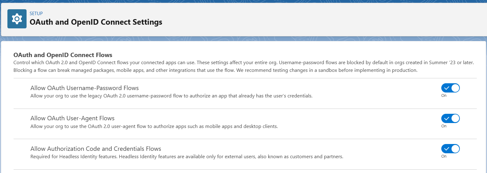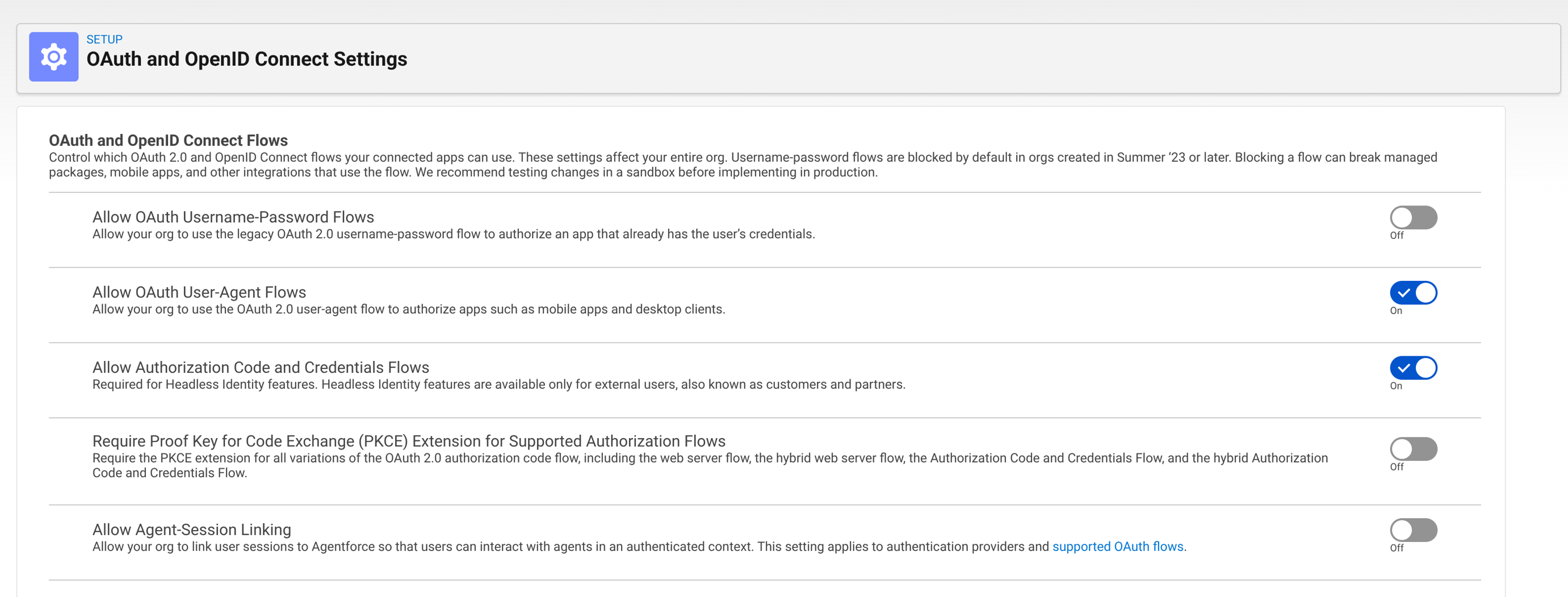 1. In Salesforce, navigate to Setup → Identity → OAuth and OpenID Connect Settings.