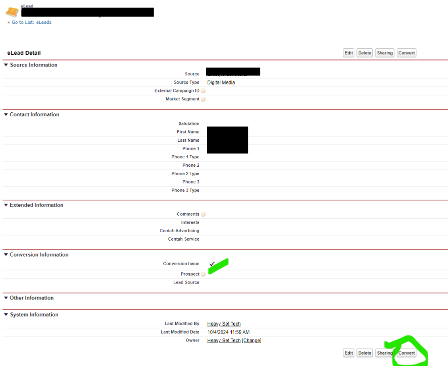 - Manually Promote the eLead: Click the Convert button to turn the eLead into a prospect.