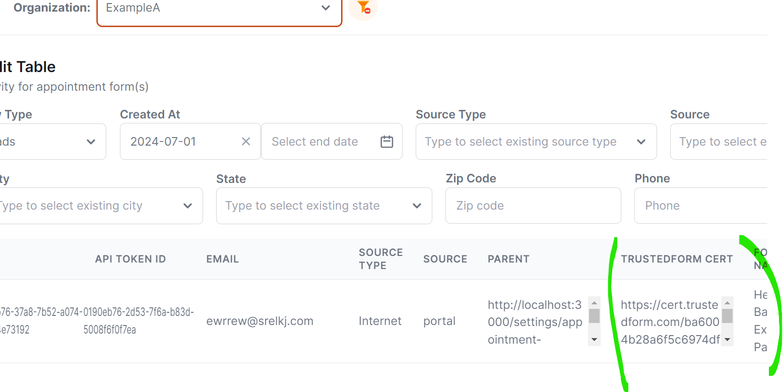 Once TrustedForm is enabled, you will be able to view the TrustedForm Cert URLs on the lead audit table page. These Cert URLs serve as proof of the lead's authenticity and can be accessed here: Lead Audit Table.