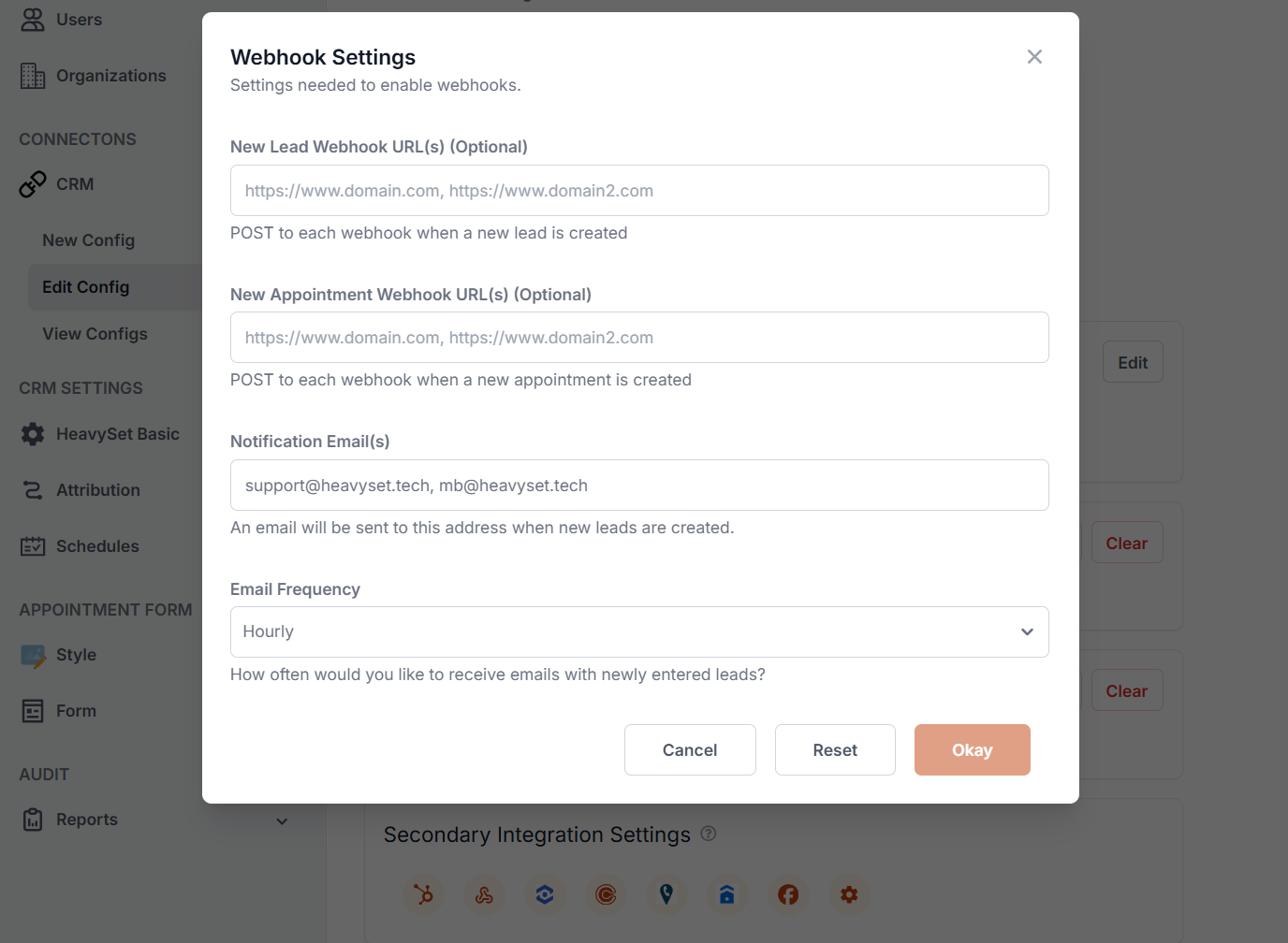 HeavySet Tech allows you to send lead or appointment data to external systems using webhooks. This is useful if you want to trigger custom workflows, notify other systems, or integrate with services not covered by our standard CRM integrations.