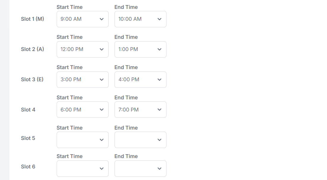 | Slot 1 (M) | Morning appointment time | ✅ Required |