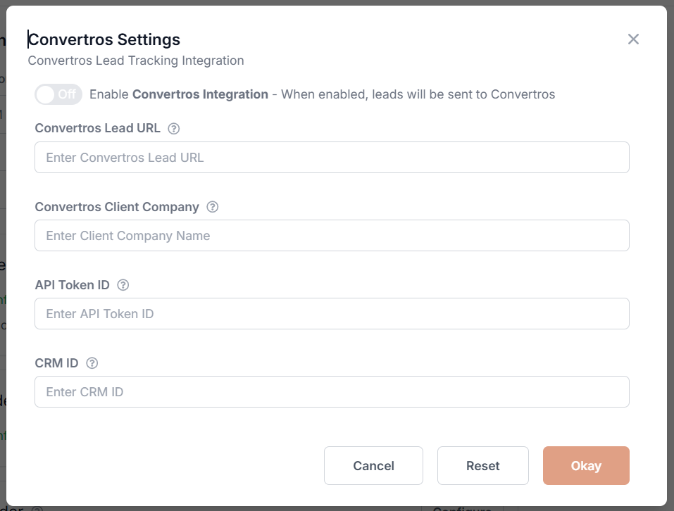 - CRM ID - Allows Convertros to save appointments back to your CRM